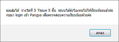 **ยกเว้นรางวัล ที่ 5 ของข้อ 2 (Tissue จำนวน 5 ชิ้น) ที่ระบบจะทำการส่งให้โดยอัตโนมัติ