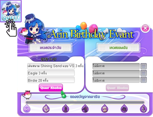- รับเควสในแต่ละวันได้จากอาริน ภายในเกม คลิ๊กรับเควสได้ที่ปุ่มซ้าย วันละ 3 เควส (แรนด้อม)