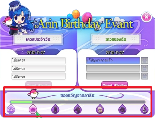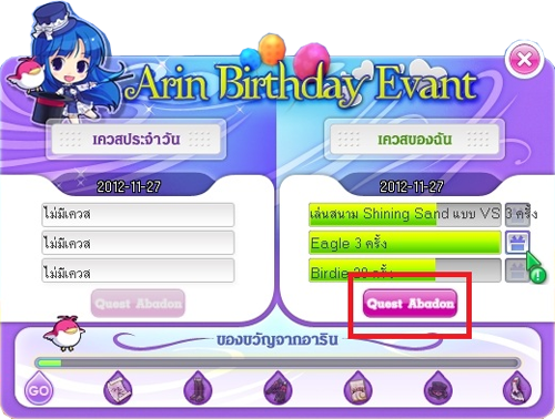 - หลังจากที่กดรับเควสมาแล้ว เควสจะย้ายมาอยู่ในช่องฝั่ง "เควสของฉัน" จากนั้นก็ลุยเควสได้เลย และเมื่อทำแล้วจะมีเกจสีเขียวขึ้น เมื่อเกจเต็ม แสดงว่าเราได้ทำเควสสำเร็จ ให้คลิกที่รูปกล่องของขวัญเพื่อรับไอเทมได้เลย